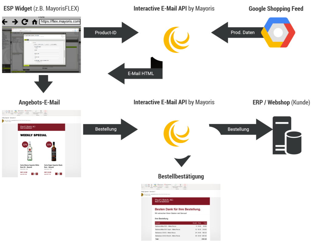 Die User-Experience darf dabei auf keinen Fall schlechter sein als bei der herkömmlichen Teaser-CTA-Webshop Mechanik. Um die Erstellung der E-Mails möglichst weitgehend zu automatisieren, werden die Produktdaten über einen Google Shopping Feed direkt aus dem Webshop geladen. Lediglich Produktnummer und Rabattierung müssen bei der Erstellung der E-Mail eingetragen werden. Die Erzeugung des HTML Codes erfolgt durch die von Mayoris entwickelte API für interaktive E-Mails. Sie ermöglicht es, auch ohne spezialisiertes Wissen, interaktive Elemente für E-Mails zu erstellen. Der dabei erzeugte HTML-Code ist grundsätzlich unabhängig vom eingesetzten E-Mail System (ESP). Schliesst der Empfänger den Kauf ab, wird die im E-Mail System hinterlegte Kunden-Identifikation mitgegeben. Die Bestellung wird damit an das ERP-System übergeben und eine Bestellbestätigung versandt. Um Missbrauch vorzubeugen, werden die Bestelldaten serverseitig validiert und die Benutzer-ID überprüft.
