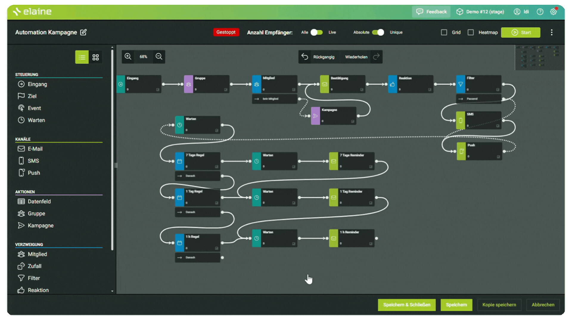 ELAINE, die Marketing Automation Plattform, ermöglicht durch den innovativen, personalisierten und automatisierten Ansatz eine völlig neue Art des Kundenengagements über alle Kanäle hinweg. Diese fortschrittliche Technologie ermöglicht es Unternehmen, nicht nur die Kundenbindung zu stärken und die Akquisitionskosten zu minimieren, sondern auch die gesamten Marketingprozesse zu optimieren. Darüber hinaus bietet die Plattform eine hervorragende Customer Experience, die für den Erfolg im heutigen schnelllebigen Marktumfeld unerlässlich ist. Dank einer leistungsstarken Mailing-Engine eignet sich ELAINE auch als Software für Transaktionsmails.